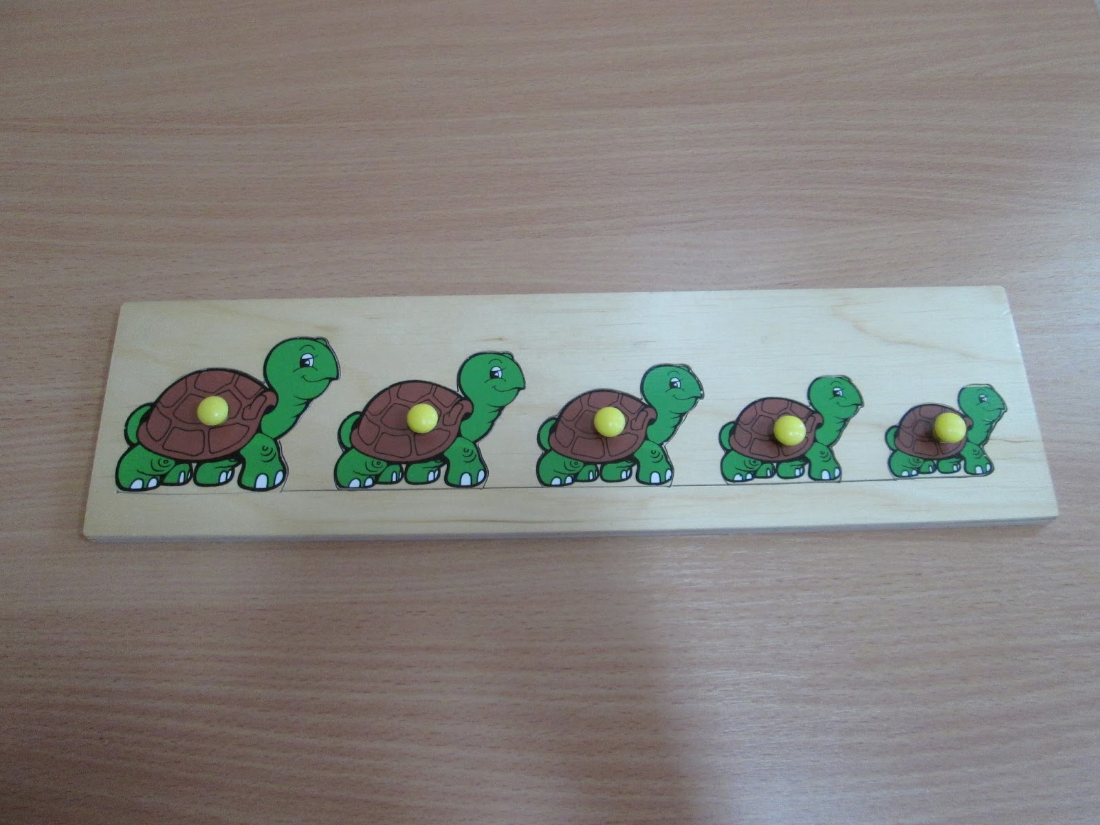 With toddlers we used some easier puzzle to learn about sizes. This simple puzzle correspond to the idea of Montessori materials to have isolation of quality. This means that all turtles are of the same type, look and color and the only difference between them is their size. So it is easier for a Child to learn in this conditions, because exactly size draws his attention.